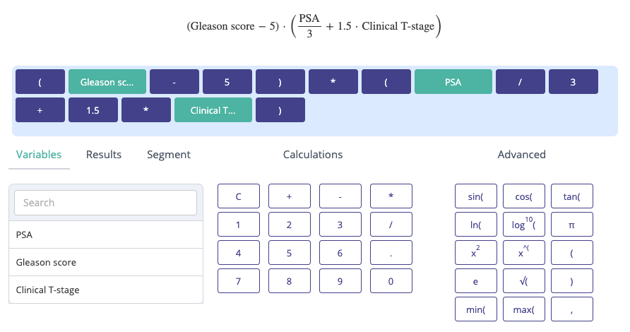 In addition to the standard calculation formats, Evidencio offers a wysiwyg / drag & drop formula tools with which you can easily define your algorithm as a custom mathematical expression.